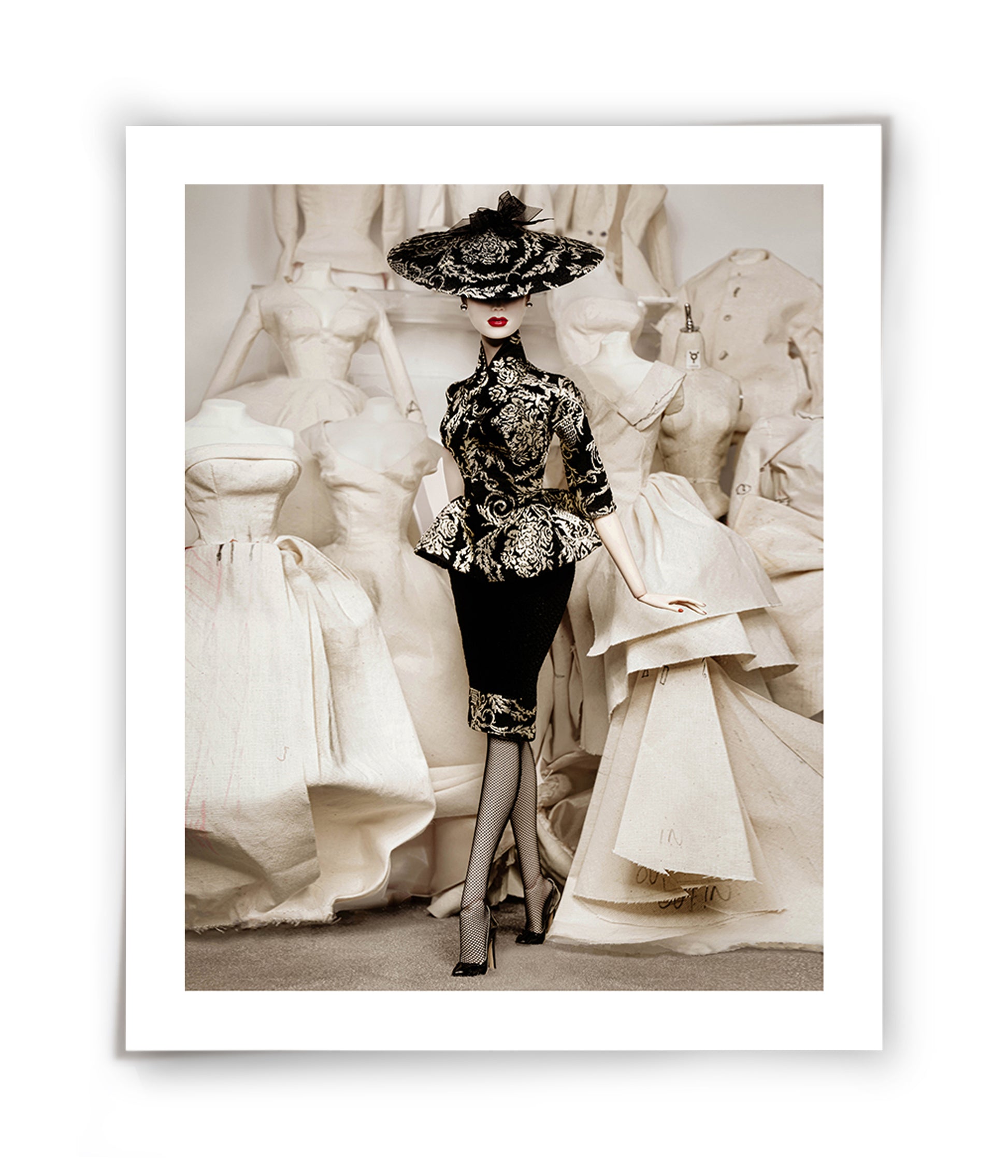 Step into the quiet majesty of the atelier, where silhouettes whisper secrets and muslin dreams prepare to take flight. Maison Muse is a fine art photograph that honors the ritual of fashion creation—elevated by the presence of a poised muse in commanding black and gold brocade.